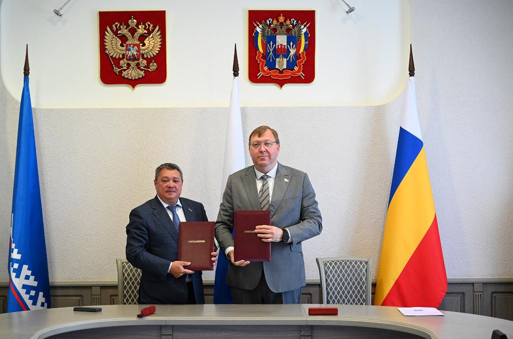 Председатель Законодательного Собрания Ростовской области Александр Ищенко и председатель Законодательного Собрания Ямало-Ненецкого автономного округа Сергей Ямкин подписали соглашение о сотрудничестве между двумя парламентами. Документ предусматривает обмен опытом по широкому кругу вопросов и подготовку совместных законодательных инициатив на федеральный уровень.