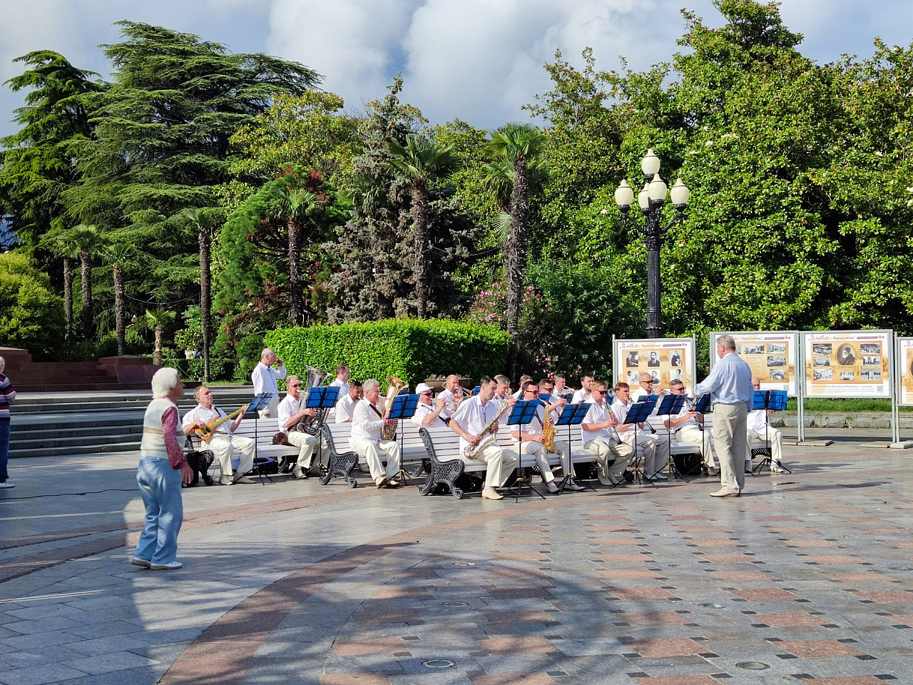 Сегодня на ялтинской набережной был обычный день. Но нужно понимать, что в Ялте не бывает летом будничных дней, на набережной каждый день - праздничный. Играет оркестр, по всей протяженности набережной выступает множество самодеятельных артистов. У людей на набережной всегда праздничное настроение.