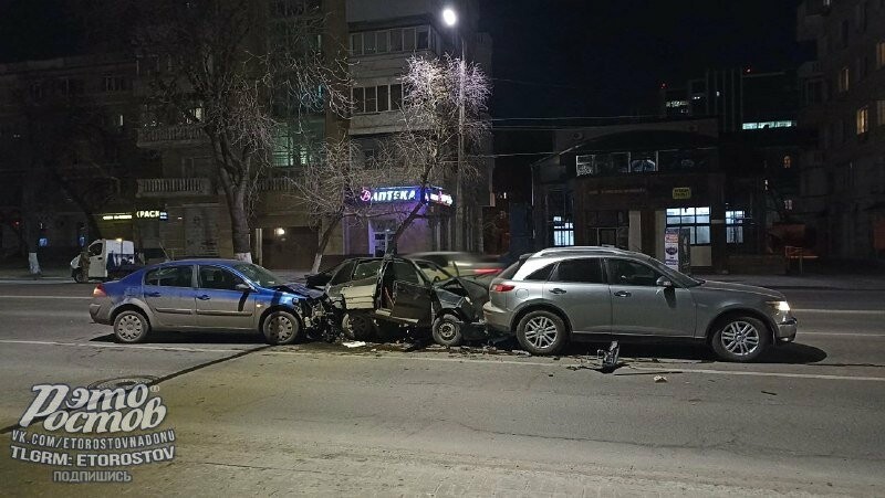 Поздним вечером 9 февраля в центре Ростова произошла авария с участием трёх автомобилей, сообщил 1rnd.ru очевидец, проезжающий мимо места происшествия.