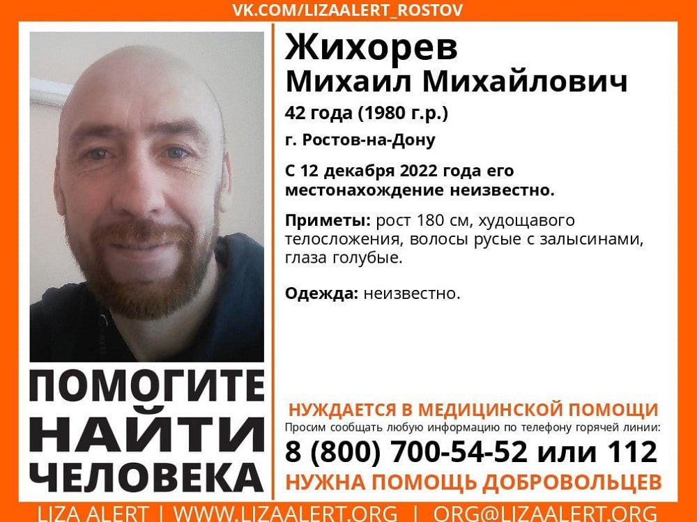 Мария Саймон ИА «ДОН 24» # Происшествия #Лиза Алерт Юг #Ростовская область #Ростов-на-Дону Поделиться: В Ростове пропал 42-летний мужчина с голубыми глазами 01.01.2023 Фото: «ЛизаАлерт» Ростовской области ©Ростовская область, 1 января 2023. DON24.RU. В Ростове разыскивают 42-летнего мужчину. Михаил Жихорев пропал 12 декабря, сообщается на странице поискового отряда «ЛизаАлерт» Ростовской области.