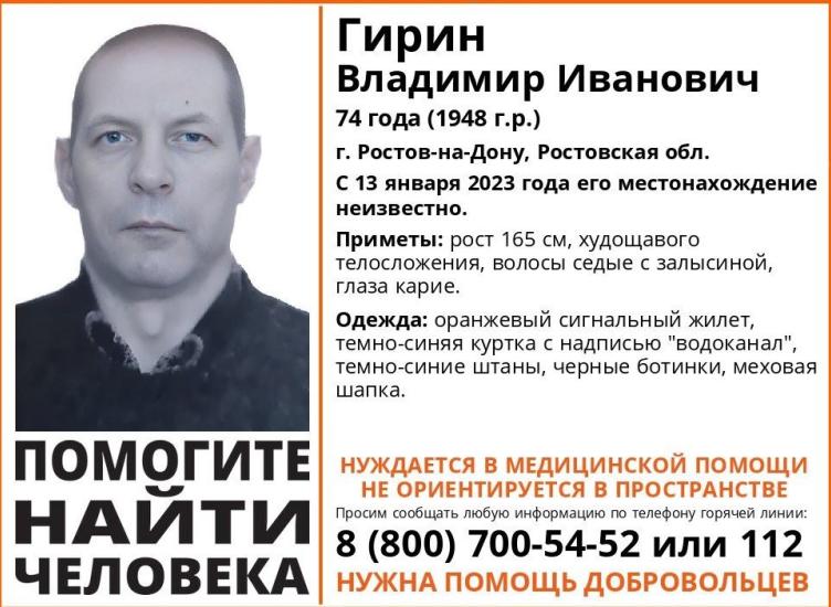 Ростовская область, 14 января 2023. DON24.RU. В Ростове разыскивают без вести пропавшего 74-летнего Владимира Гирина. Об этом сообщили в поисковом объединении «ЛизаАлерт».