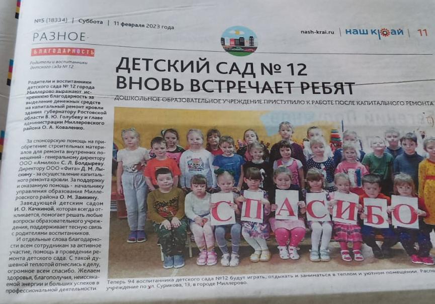 Тем не менее, на прошлой неделе в газете «Наш край» была опубликована благодарность от родителей и воспитателей д/с № 12 (без указания конкретных лиц) за оказание содействия в ремонте, где, кроме губернатора В.Ю. Голубева и гендиректора ООО «Амилко» С.Л. Болдырева были озвучены и другие лица, среди которых оказался даже директор ООО «Фита» Лыскин Д.М.