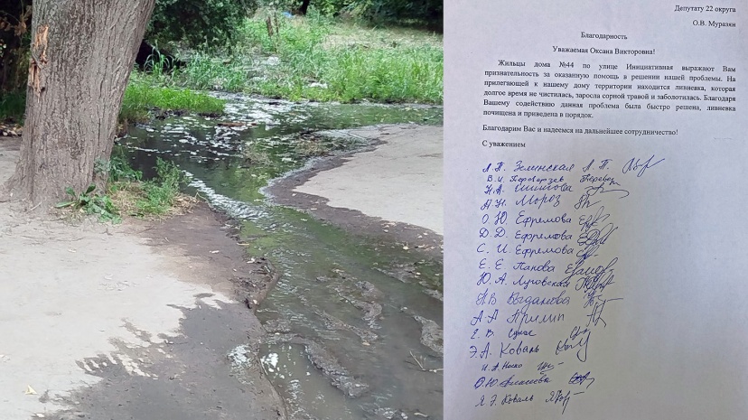 На одной из встреч в период предвыборной кампании ко мне обратились жители дома на ул. Инициативной, 44 по поводу состояния участка ливневой канализации на территории, прилегающей к дому. Ливнёвка долгое время не чистилась, поэтому заболотилась. Это вызывало множество неудобств для местных жителей, так как дождевая вода скапливалась и создавала некомфортные условия для проживания.