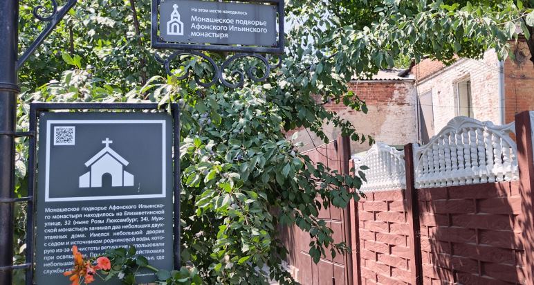 В книге таганрогского краеведа О.П. Гаврюшкина «Отблески золотых куполов» о Таганрогском подворье Афонского Ильинского скита написано следующее: «Одно из монашеских подворий, имевшихся в Таганроге, располагалось на Елизаветинской улице, 32 (Розы Люксембург, 34). Мужской Афоно-Ильинский монастырь занимал два двухэтажных дома, сохранившихся до наших дней. Имелся небольшой дворик с садом и источником родниковой воды, которую из-за ее чистоты верующие использовали при освящении. При монастыре действовала небольшая церковь во имя святого Ильи, где службы служил иеромонах Исаия. В 1920 году подворье посетила комиссия, которая, ознакомившись, доложила горсовету, что «во дворе живут два монаха как сторожа».