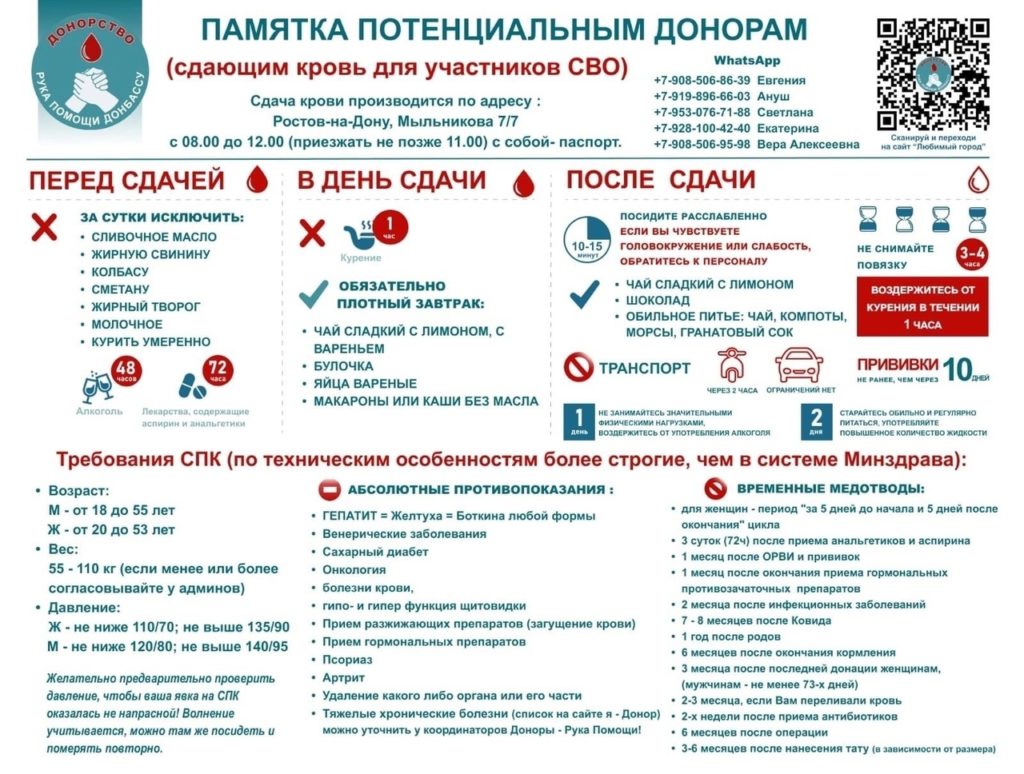 «Волонтерское движение «Рука Помощи Донбассу» приглашают граждан Ростова-на-Дону и близлежащих городов , не имеющих медицинских противопоказаний, протянуть руку помощи нашим защитникам и стать донором — добровольцем для Ростовского военного госпиталя, присоединившись к нашей акции», — говорится в сообщении.